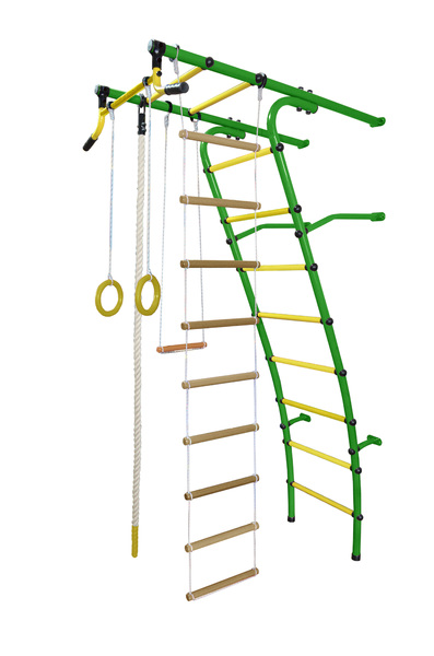 Комплектация: составной турник с широким хватом, изогнутая шведская стенка, трапеция, канат, кольца, верёвочная лестница.